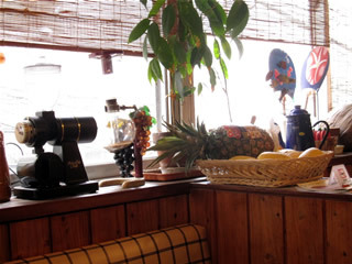 窓際にフルーツに関する本や雑貨が置いてあり、独特の雰囲気。
