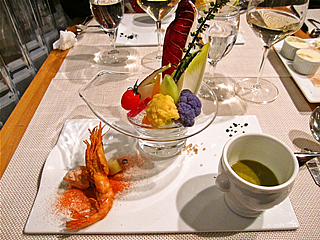 バーニャカウダと一緒に甘エビのフリット、野菜の酢漬けが添えてあり、甘エビは大きめで頭から食べると味噌の風味が。