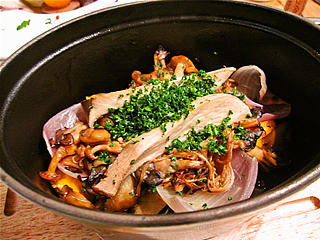 メインと一緒に運ばれてきたイモ類、キノコ類、たまねぎなどが入った温野菜。