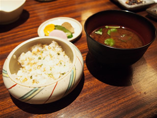 名物ちりめんご飯と本日の椀物、自家製漬物。