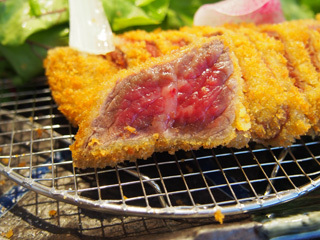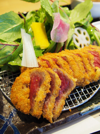 牛かつは厚切りで、外側の衣だけカラッと揚がっているのでレアです。