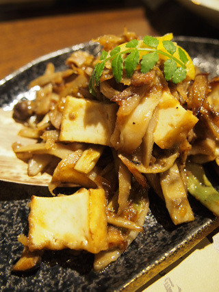シャキシャキというより、やわらかい食感で、ごぼうなどたくさんの野菜、豆腐と柚子味噌で炒めてあります。