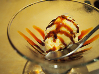 デザートは手作りバニラアイスに苦味の利いたキャラメル。