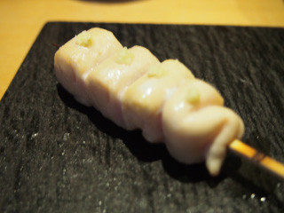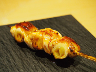 手羽もとを開き、那須の白美人ねぎ「軟白ねぎ」を巻いたあっさりした焼き鳥。