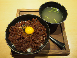 甘辛く煮付けたそぼろにう玉(うずらの黄身)がのった丼のハーフサイズに、スープのセット。