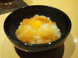 大根おろしにう玉(うずらの卵の黄身)がのっていて、焼き鳥の合間に口直しとしていただきます。