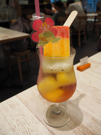 フローズントロピカルフルーツたっぷりの、カラフルなアイスキャンディー入りドリンク。