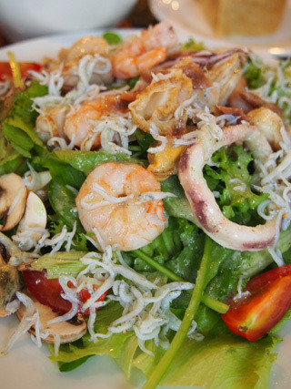 この日のサラダは魚介野マリネと葉野菜のサラダ。