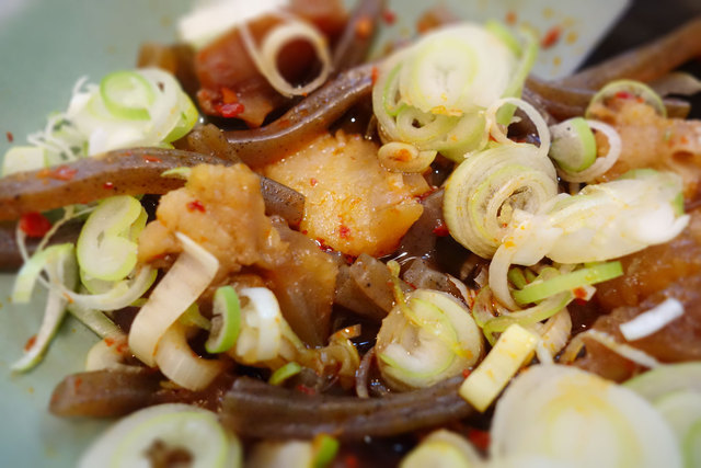 牛すじと糸コンニャクを煮てネギを加えてピリ辛に和えたもの、