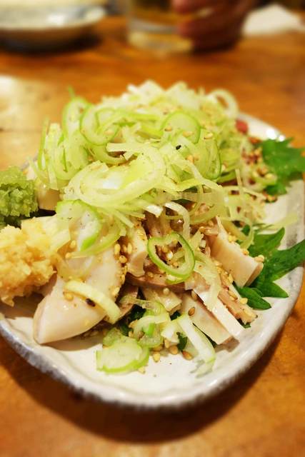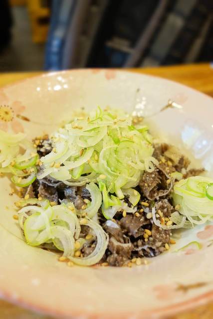 ゴマ油がかかったタンとガツのコリコリした食感がたまりません。