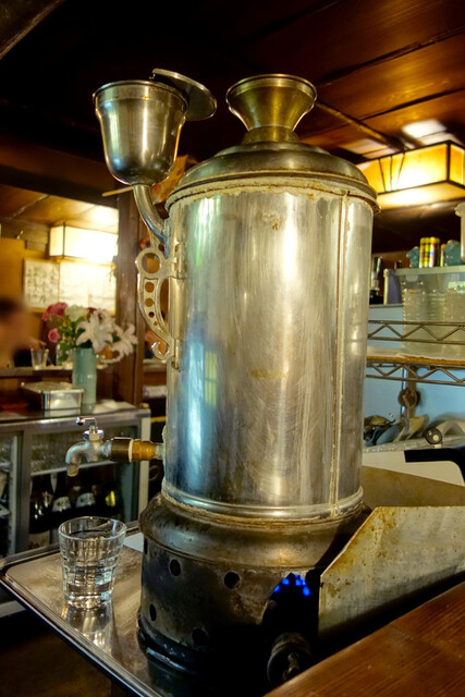 このステンレス製の酒燗器は上部のじょうごからお酒を注ぐと、