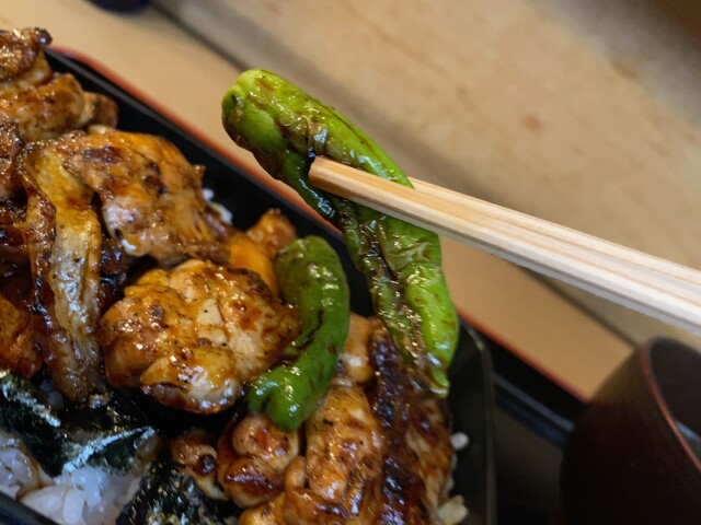 お重の蓋を開けると.. いい感じの焼き目が入った鶏肉がたっぷり... そして獅子唐が添えられてます。