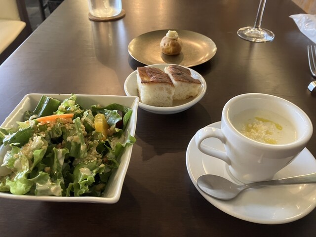 アミューズ、サラダ、じゃがいものビシソワーズ、フォカッチャ