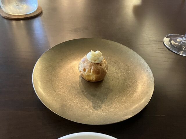 デザートのモモのジェラート、アイスコーヒー、サービスの焼き菓子:メレンゲ、フィナンシェ、レモンのケーキ