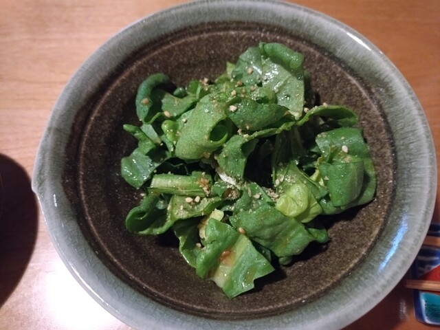 春菊のサラダ 生の春菊にドレッシングがかかってます。
