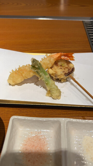 お通し3品、刺身、サラダ、肉、天ぷら6品(実際は7品あり)天茶漬け、アイス