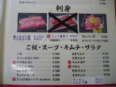 刺身類はあぶるなど火を通して提供。御飯やスープ、キムチ類、サラダ類も安い!