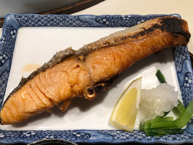 脂の乗ったぷりぷりの肉厚の鮭の切り身にカリカリに焼かれた皮が美味しい。