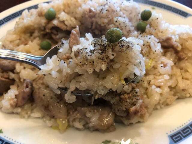 「豚肉、長葱、ご飯をあっさり塩味で炒めています」