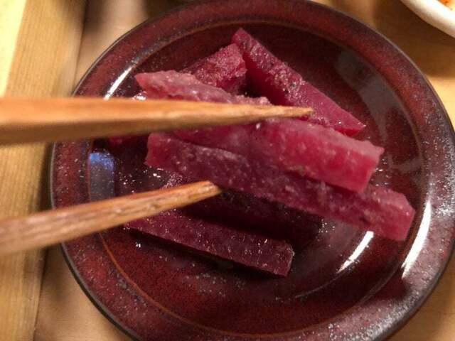 ビーツ煮干し和え鮮やかな赤が目を引く、煮干しの旨味とビーツの甘みの対話。