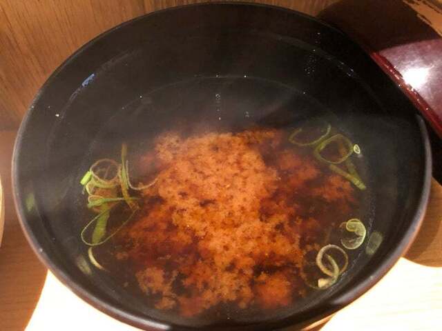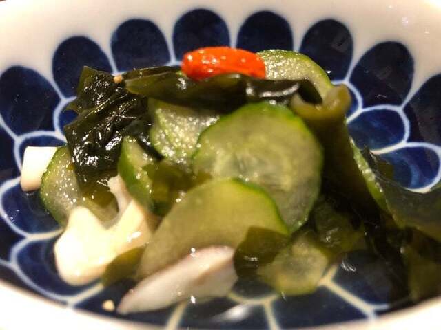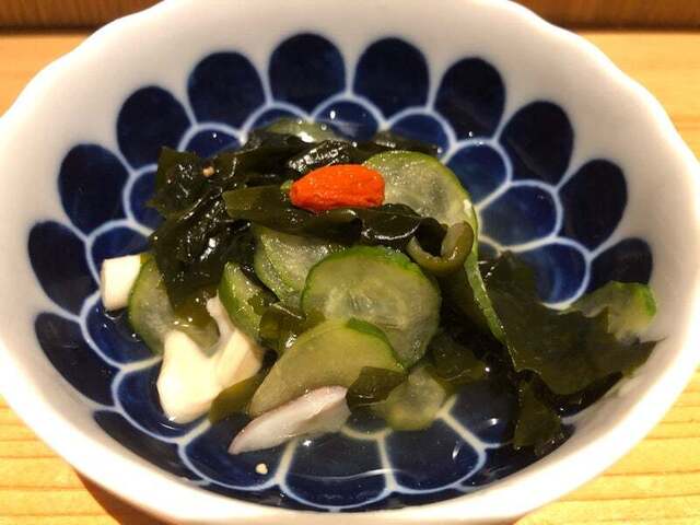 小鉢青白の器に浮かぶ、緑と白と赤の記憶。きゅうりの清涼、海藻の深み、白い柔らかさにクコの実が一粒。祈りの前に口を整える、静かな小鉢。赤出汁濃いめの出汁が体を温め、参拝後の心を整える一椀。