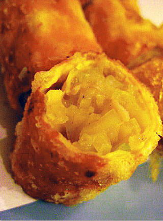 薄焼き卵で巻いた春巻は揚げたてのアッツアツ、あっさりシンプルな具が卵と調和