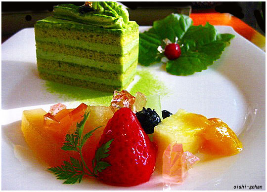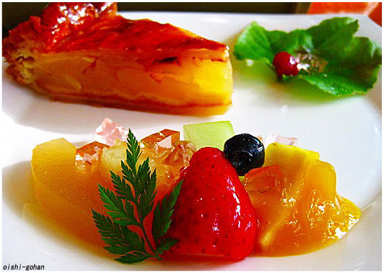 リンゴのコンポート、メロン、パイナップルなどがゼリー、マンゴーソースと共に