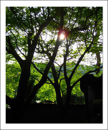 木々の合間から零れる優しい夕方へと向かう光、揺らめく葉が心を和ませてくれます