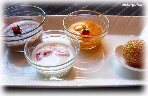 左から、チョコレートムース、フルーツ入りタピオカミルク、マンゴープリン