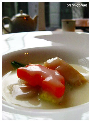 お次はエノキや竹の子、具沢山な醤油風味のフカヒレスープ