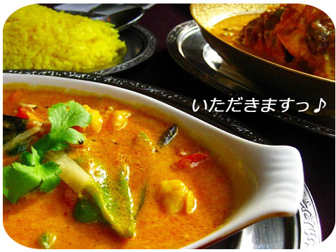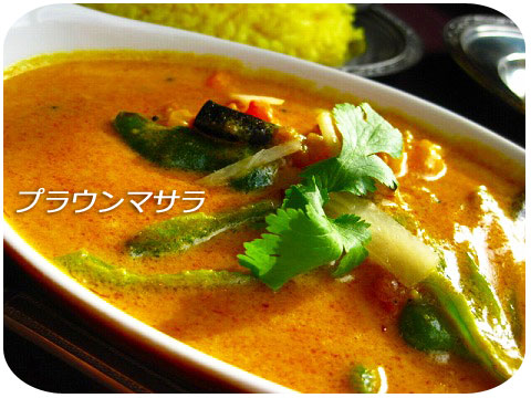 ココナッツミルクが入った辛めのプラウンマサラは出来上がり直前に入ったトマトや玉ねぎ、