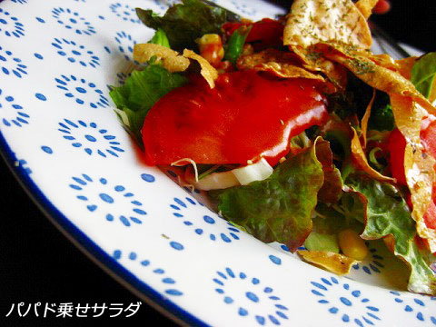 お豆の粉で作った薄いおせんべいパパドが乗ったサラダ、パパドおいしいね〜(*^-^)