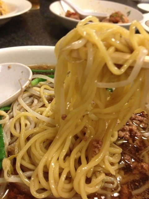 ひき肉にもやしとニラが入ってて、麺はタマゴ麺な感じで、とても歯ごたえがあって噛めば噛むほど味が出る。