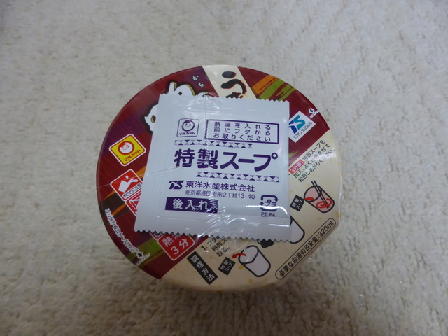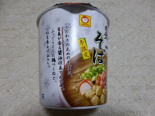 マルちゃん。うまいつゆ 鴨だしそば。液体スープが効いている、55g。 (2015/02/28)