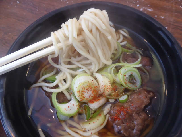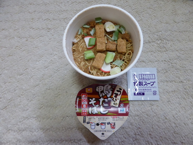 鴨だしそば。液体スープ、3分油揚げ麺。