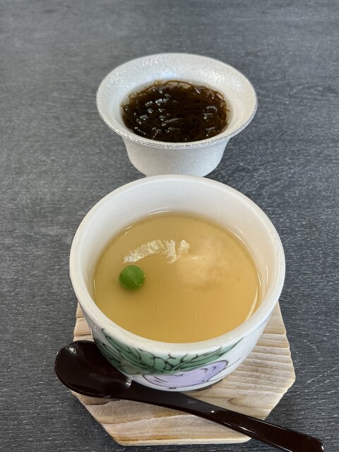 もずく酢、茶碗蒸し、いか活造り、いかシュウマイ、茶碗蒸し、いか後造り、ご飯、味噌汁、お漬物、デザート