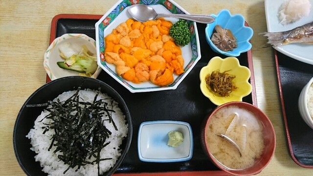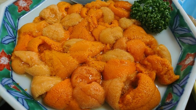青い小樽の海の前の食堂でいただく北海道の海の幸