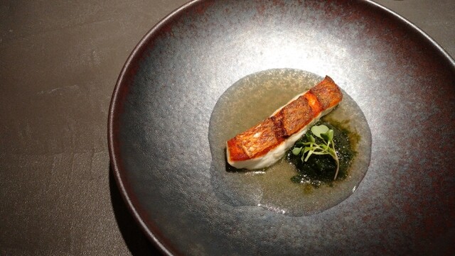 焼かれた鯛と生海苔が盛られた皿が置かれた後、テーブルでブイヨンを身を浸す程度の量に静かに注がれます。