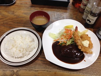 本当はハンバーグとヒレカツ、カニクリームコロッケだったのですが、ヒレカツが切れてしまったということでエビフライになりました。