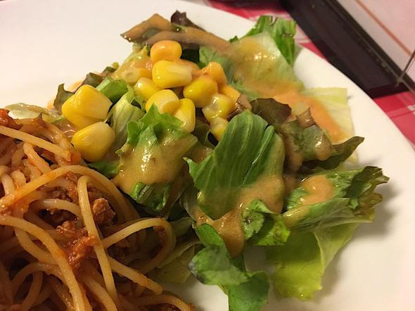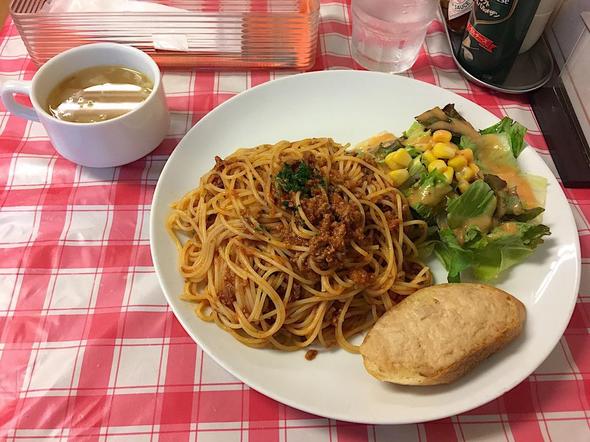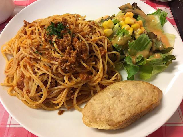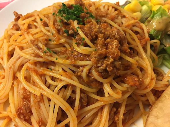 細いパスタに挽肉がたっぷりのミートソースで仕上げてあります。肉の旨味が出ていて美味しくまろやかですが、ほのかに酸味も感じられます。