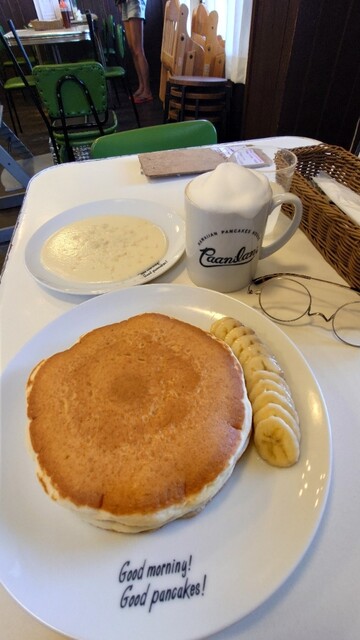 隣の席に座った若者たちが、16枚のパンケーキが積まれたパンケーキタワーを注文していて、パンケーキ好きには夢のような光景でした。
