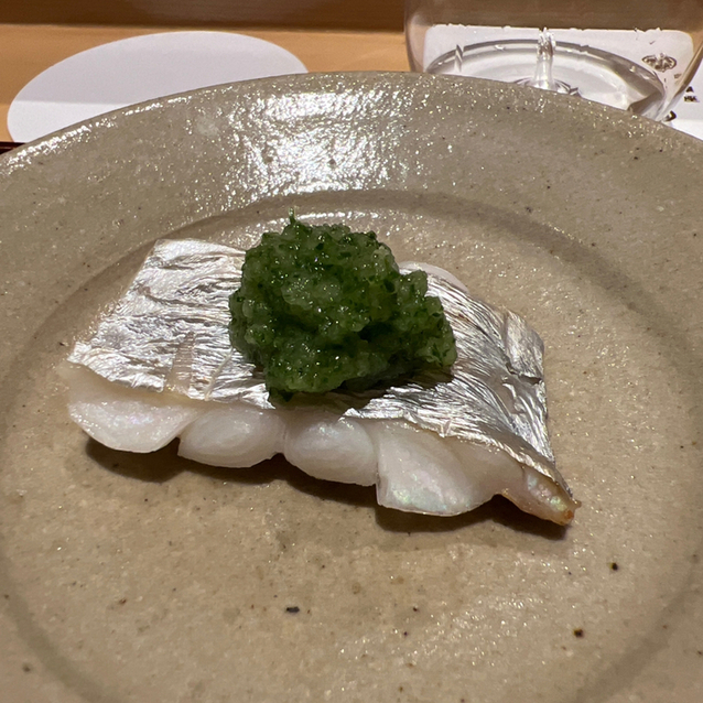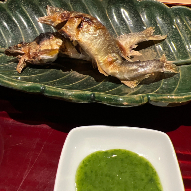 琵琶湖の小鮎、串焼の生姜醤油、塩焼き、握り三連発。