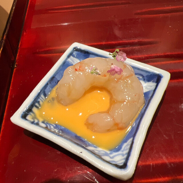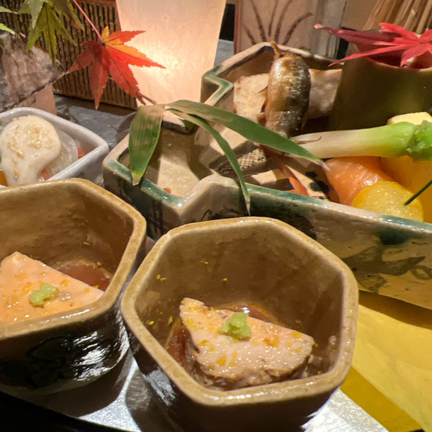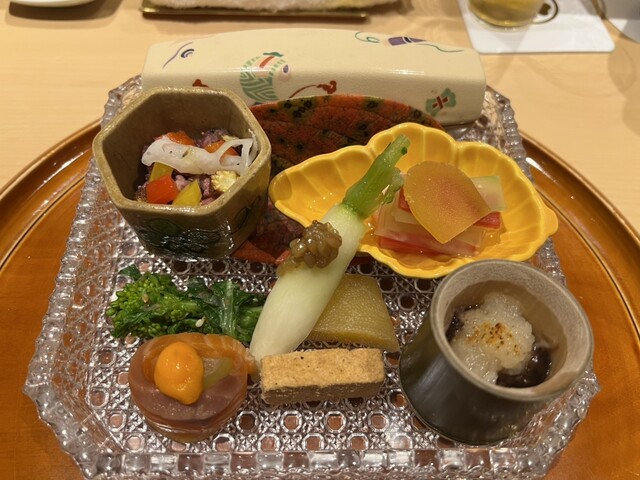 赤コンニャク、金山寺味噌とキュウリ、蛍烏賊の藁炙り、玉子真薯、