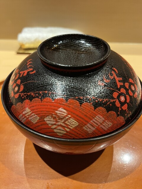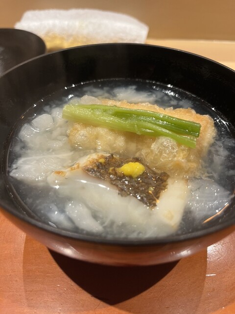 お椀は真鯛、東寺湯葉(鱈白子と海老すり身)砕いた蕪みぞれ仕立て