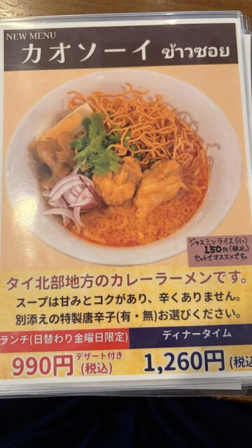 内装も清掃が行き届いていて感じが良く、こういうお店はお料理の仕上げも良いはず。ランチメニューの一つに「曜日限定」のものがあり、金曜日は「カオソーイ」。ランチタイムはこれが990円でしかもミニデザート付です。