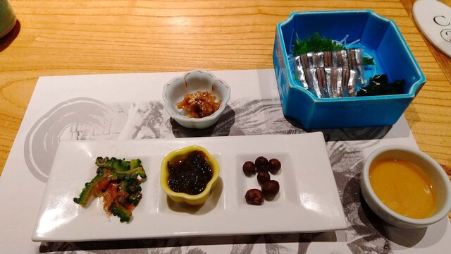 まず、つきだしとして、ゴーヤの和え物、もずく、むかご。むかごを食べるのは久しぶりです。郷土料理店などでしか出てきませんからね…。奥の中央は豚味噌…といったかな。ご飯に合いそう…ですがコースだとご飯は最後にならないと出てこないんですよね(苦笑)。
