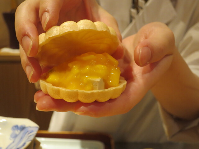 今回、淡路島由良産の赤雲丹がたいへん逸品で美味しく、また最後に提供された水羊羹は以前働いていた島袋料理長の自慢の一品でとても美味しく頂きました♪