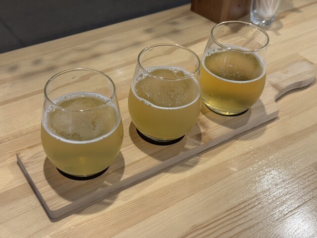 ★テイスティングセット、2,200円+②、100円(左から①Harunire、②In the snow、⑧GOLDEN ALE)