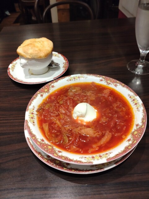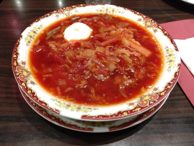 こちらのボルシチはとてもコクがあって綺麗で美味しいです。牛肉のしぐれみたいな感じで入っているのでそれがコクになっているのかな。とにかく美味しい♡