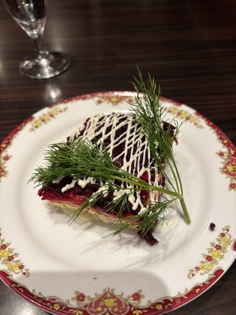 料理の種類が多く何を頼んでも外れはないのですが、私が最も気に入っているのが最初に訪れた日から感動して大好きで、毎回必ず食べている毛皮を着たニシンという料理。